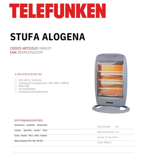 Stufa al Quarzo Telefunken M08215 800W Basso Consumo con Doppia Potenza e Sicurezza Antiribaltamento